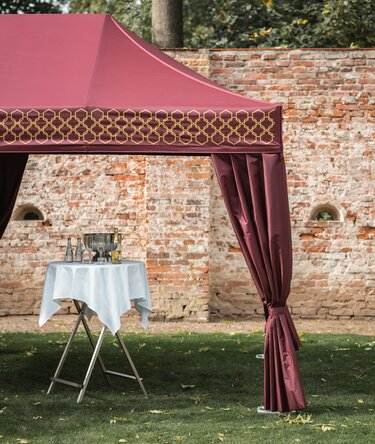 Unter dem eleganten Faltpavillon mit Himmel stehen 2 Personen mit einem Glas Prosecco in der Hand.
