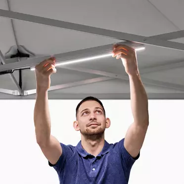 5. Das Netzkabel nach Gebrauch wieder ausstecken. Beim Transport des Faltpavillons ist es ratsam, die LED-Leisten von der Dachstruktur abzumontieren, um Schäden beim Transport zu vermeiden.