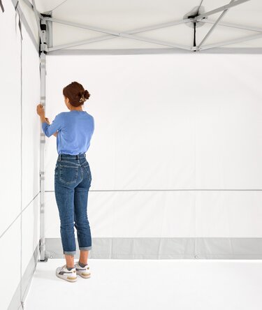 Mach es dir bequem! Die Seitenwand mit aufrollbarer Tür ermöglicht es dir, einen Eingang zu schaffen, um deinen Faltpavillon nach Belieben zu öffnen und zu schließen. Die Tür kann sowohl von innen als auch von außen über zwei Reißverschlüsse vollständig geöffnet und aufgerollt werden.
