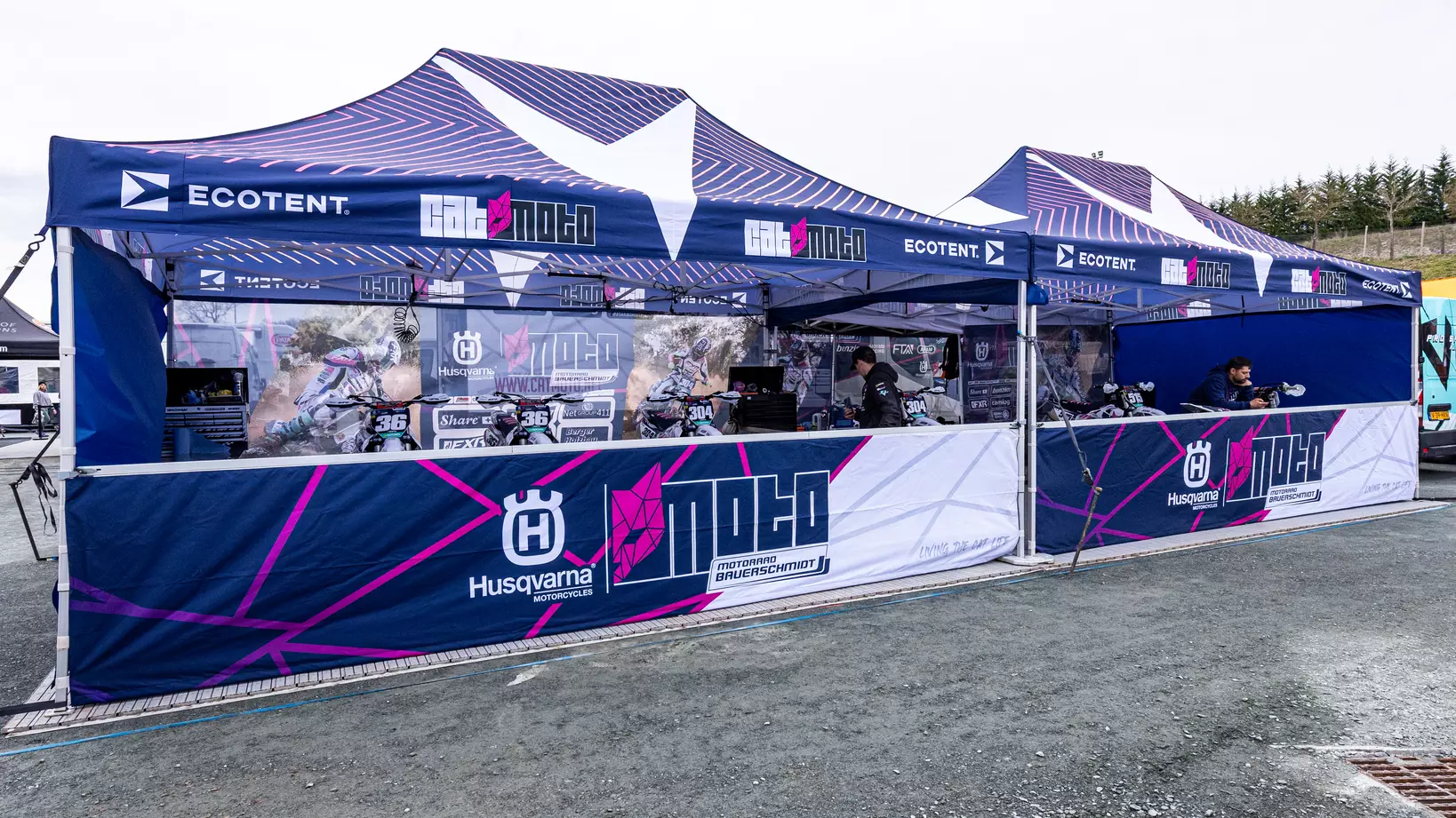 The first real test came with a major storm and both pop-up gazebos held strong. Motorbikes, tools, and team members stayed safe and dry, proving the tents’ reliability. Cat Moto particularly appreciates that Ecotent pop-up gazebos are modular and adaptable, allowing them to adjust easily to different tracks and paddock sizes.