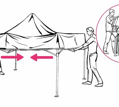 2 minutes, one or two people and a few simple steps, that's all you need. Our folding tents are quick and easy to assemble. The process is very intuitive, but if it is your first time be sure to proceed as efficiently as possible by following these instructions. Step by step, we show you how to assemble your Ecotent® folding tent in just 2 minutes, with clear pictures and videos. The best thing? The entire assembly and disassembly process is done without tools!